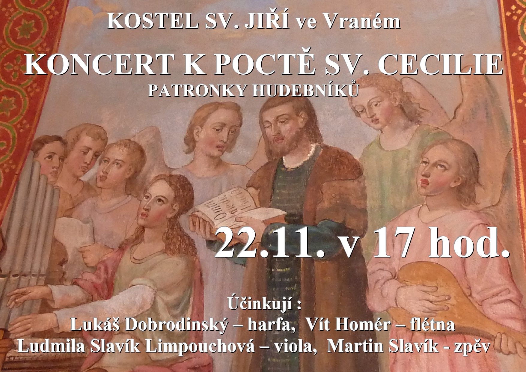 do kostela sv. Jiří, kde se uskuteční koncert k poctě cv. Cecilie, patronky hudebníků. Vystoupí Lukáš Dobrodinský (harfa), Vít Homér (flétna), Ludmila Slavík Limpouchová (viola), Martin Slavík (zpěv).