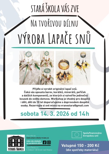 Přijďte si vyrobit originální lapač snů přesně podle svého vkusu! Čeká vás spousta barev, korálků, peříček a dalších komponentů, ze kterých si vytvoříte jedinečný kousek do svého domova.Rezervujte si své místo na vranestara@gmail.com