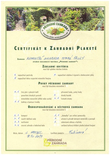 Od roku 2019 se naše zahrada pyšní i certifikátem a plaketou "Přírodní zahrada". Splnili jsme daná kritéria a zařadili se do sítě přírodních zahrad v ČR!
