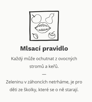 Nepoužíváme umělá minerální hnojiva, pesticidy, herbicidy, chemické postřiky ani rašelinu k úpravě půdy. V zahradě máme listnaté stromy a keře (mnohé z nich ovocné), květiny a kvetoucí trvalky. Hospodaříme s kompostem a s dešťovou vodu. Mulčujeme, využíváme přírodní materiály, pěstujeme zeleninu a bylinky a v zahradě máme ubytování pro zvířecí pomocníky.