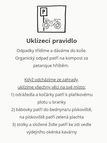 Zahrada je otevřená veřejnosti Po — Pá 17—19 hodin, Víkendy 10—19 hodin.
