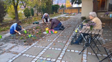- 2018 realizace formou brigád místních dobrovolníků a firemních dobrovolníků (Concur): výsadba trvalek a cibulovin, realizace vstupního plotu a branky, stojanů na kola, vybudování smyslového chodníku, dodělávky chodníků mezi květinami, pořízení nového mobiliáře (kavárnské skládací židle a stolky)
